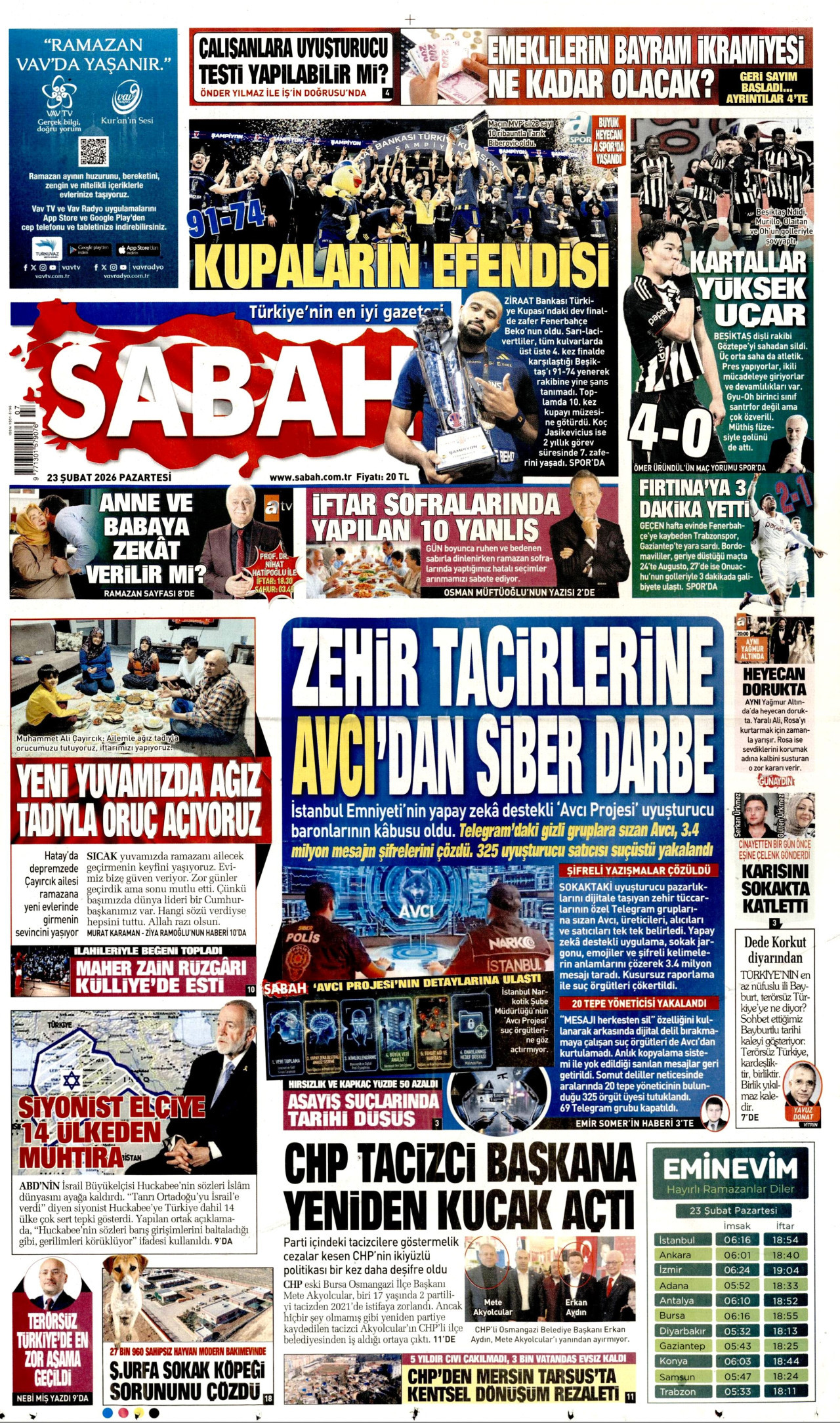 HÜRRİYET Gazetesi 23 Şubat 2026, Pazartesi Günü Manşeti