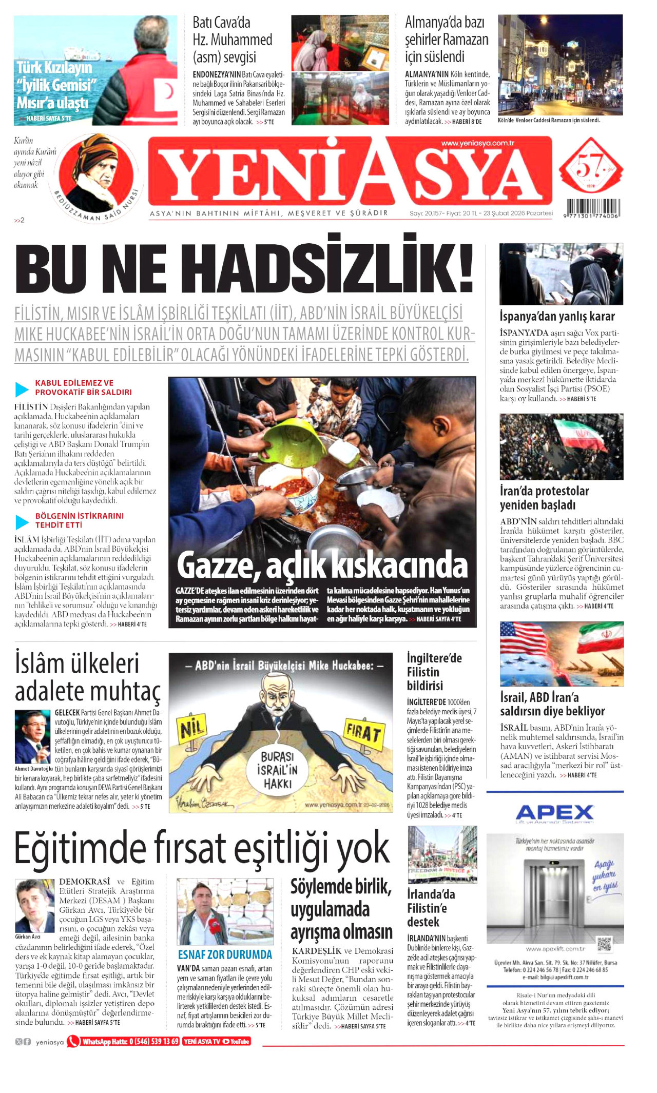 YENİ ASYA Gazetesi 23 Şubat 2026, Pazartesi Günü Manşeti