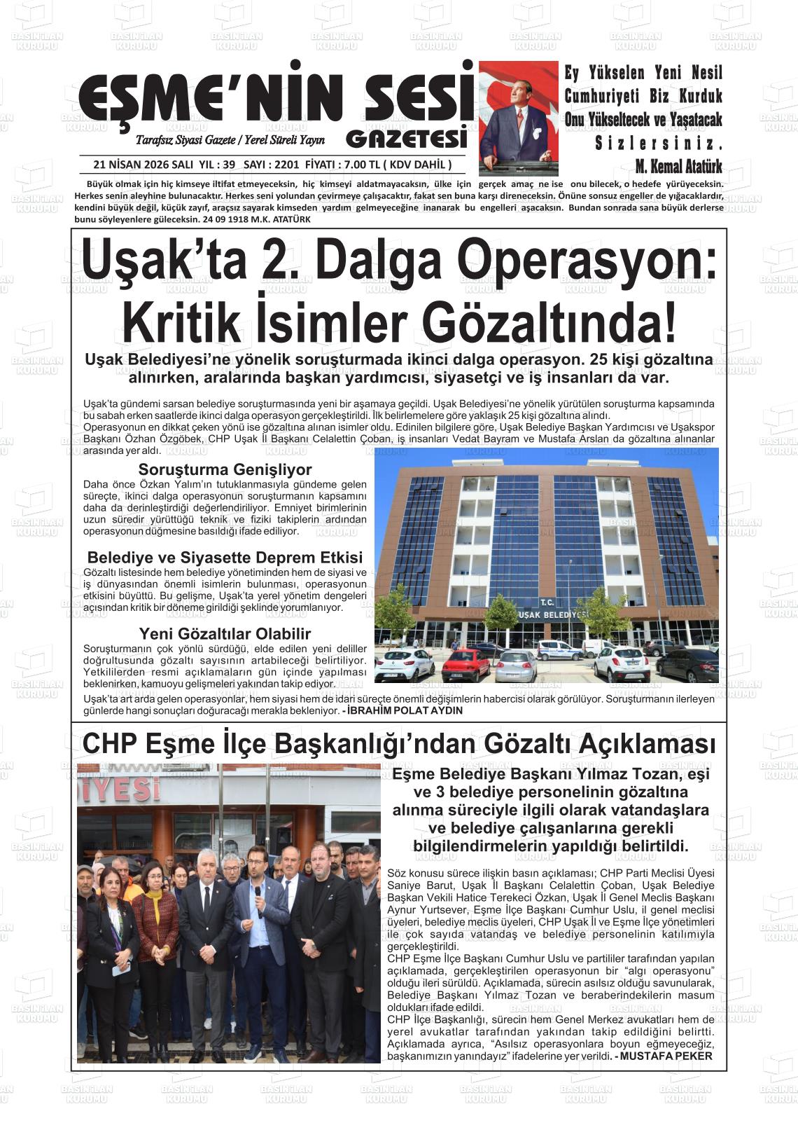 Uşak Yerel Gazeteleri 21 Nisan 2026, Salı Günü Manşeti